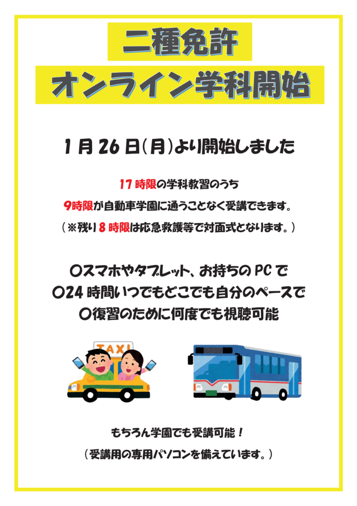 二種免許オンライン学科開始のお知らせ